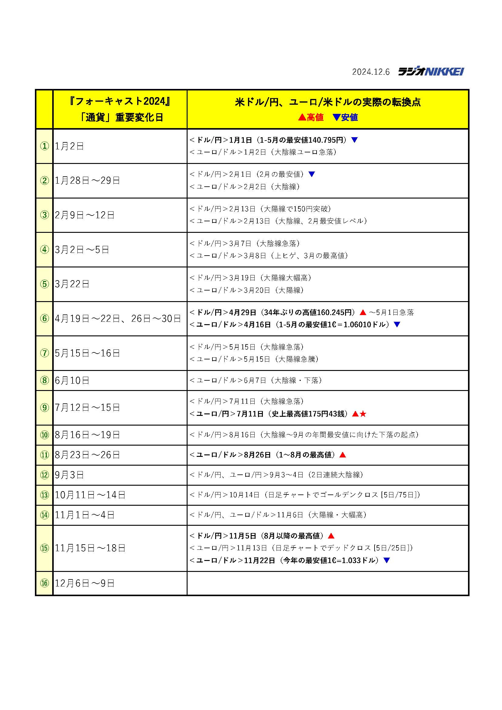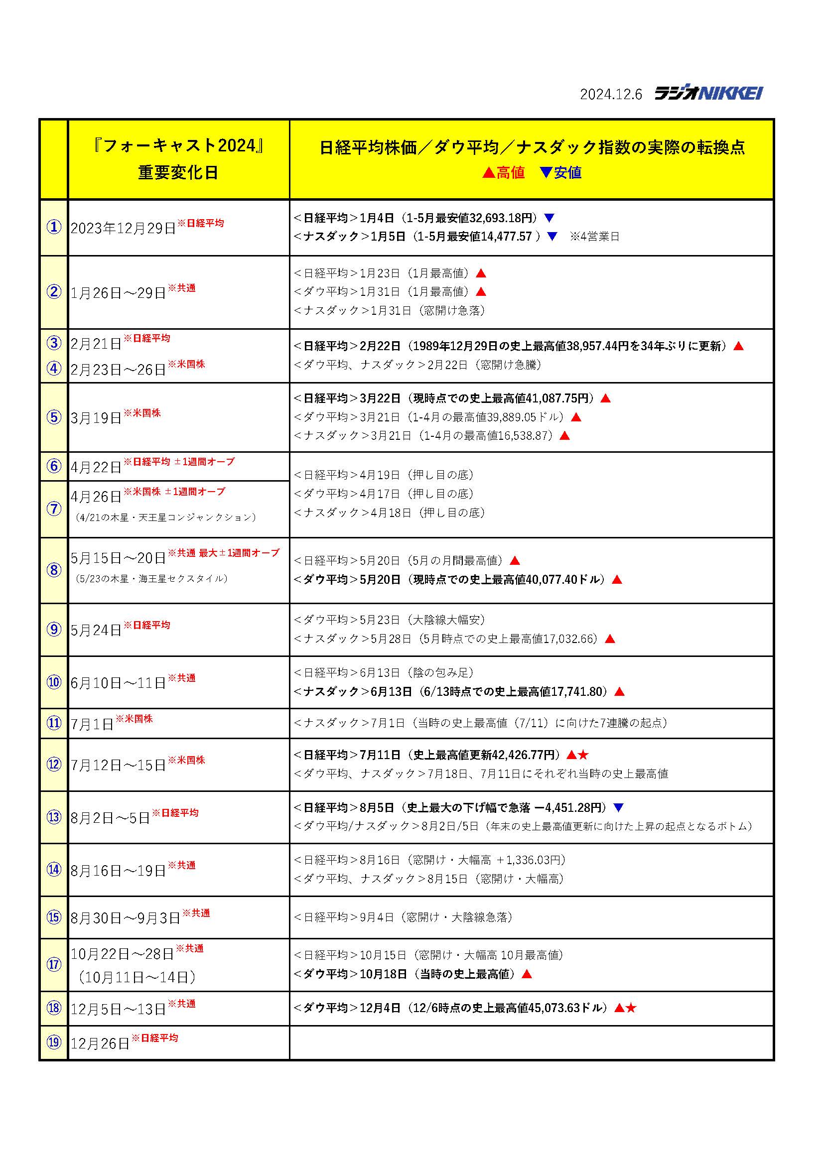 インタビューを行う上で、ベースとなっているのはメリマン氏が毎年12月に発行する年間予測本「フォーキャスト」。この本は現在の米国における占星学の大家であるメリマン氏がマンデーンアストロロジー(社会占星学)の観点から2025年を予測(フォーキャスト)する《マンデーンパート》と、相場サイクルとテクニカル、そして金融アストロロジーの3つの観点から2025年の各種金融市場の展望を予測する《相場分析パート》の2つに分かれています。特に後者のパートでは、反転が見込まれる特定の時間帯を「重要変化日」として、分析している相場ごとに掲載。その的中率の高さが毎年話題になっています。